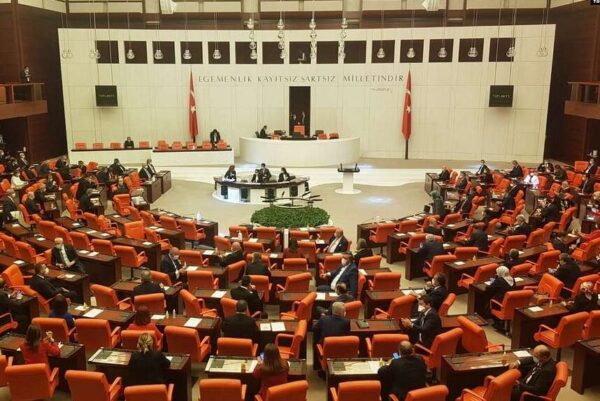The struggle for Freedom of Expression in Turkey continues. Photo: Opposition Republican People’s Party deputies hold signs in protest of a government-backed bill that criminalizes “disinformation,” at the Grand National Assembly of Turkey in Ankara, October 4, 2022. © 2022 ADEM ALTAN/AFP via Getty Images